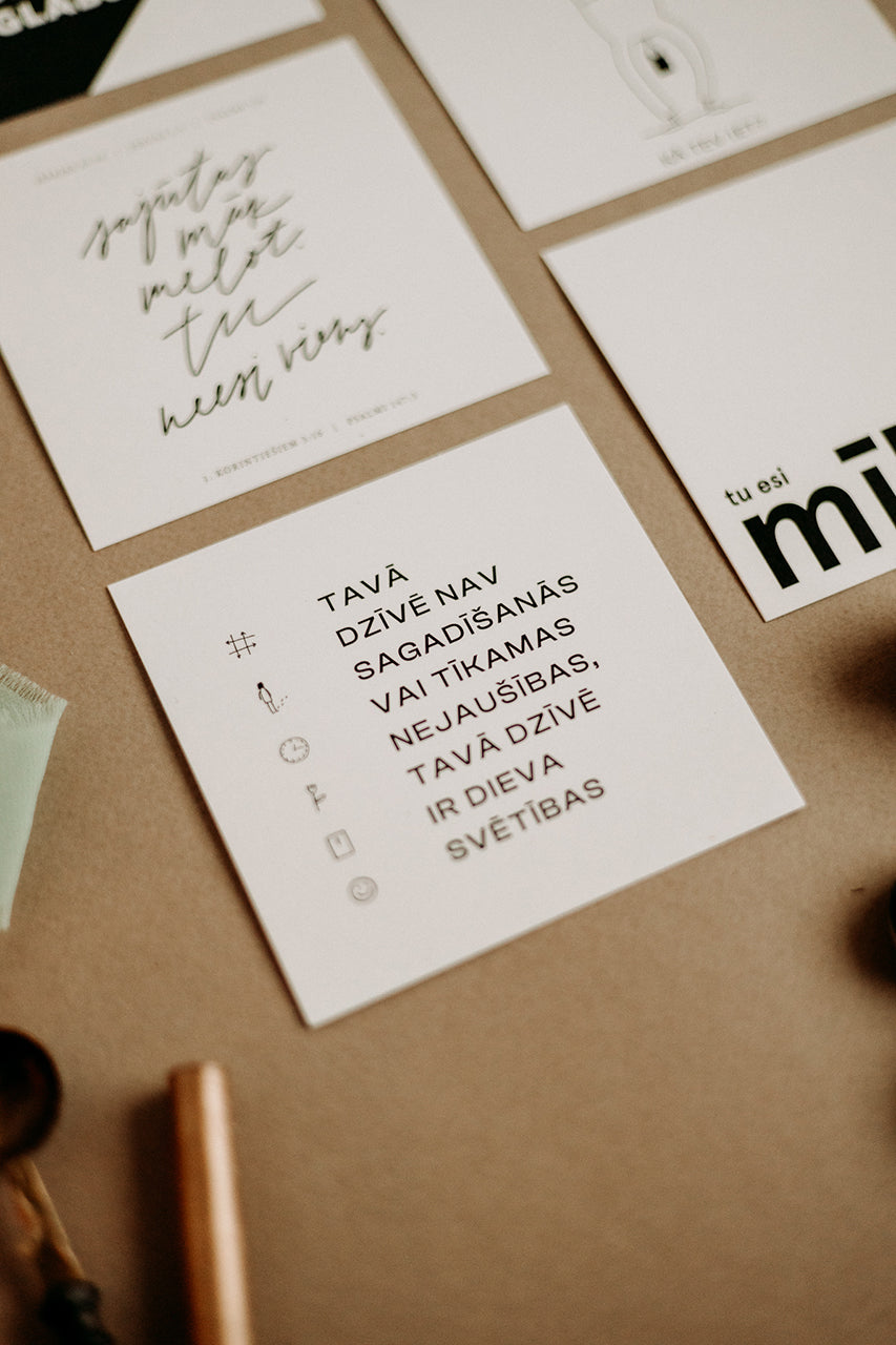 Kartītes ir skaists starpnieks starp Tevi un draugu. Iedrošinājuma un mīlestības vārdi nav jātaupa. Kartītes veidotas tā, lai arī tu varētu otrā pusē pierakstīt no sevis ko īpašu. Pieliec klāt dāvanai, atstāj sev pie ledusskapja vai iedod kādam, kuram tu vari pastāstīt, ka Jēzus viņu mīl.